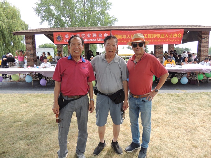 众多中国城社团侨领出席野餐会,左起,黄氏宗亲会前会长黄国铭、海外交流协会名誉会长司徒剑、协胜公会前主席陈羡韶